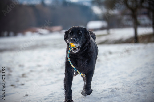 Naklejka premium Flat coatet Retriver auf einer verschneiten Wiese. Hund spielt mit seinem Ball.