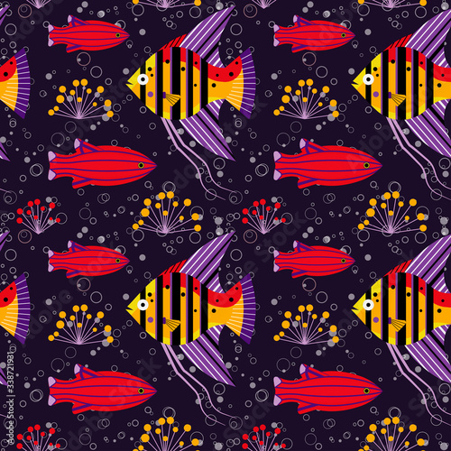 © krugli, Naklejka premium Flat Colorful Tropical Aquarium Fishes Seamless Pattern