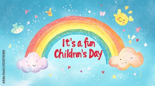 © TranNgoc, Fototapeta premium Flat 2D vector illustration with a hand-drawn rainbow arch above red handwritten text "It's a fun Children's Day", soft pastel blue background, minimal clouds floating,