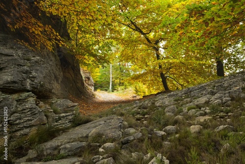 © vectorfusionart, Fototapeta premium Flat design autumn woodland trail is winding past moss-covered rock face and fallen leaves