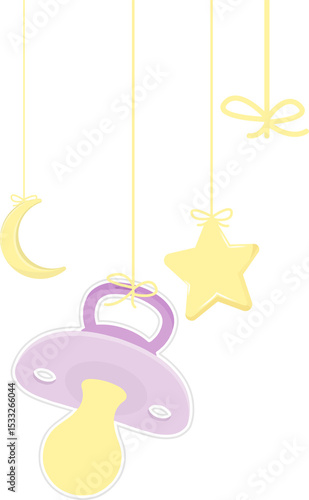 Naklejka premium Flat design baby pacifier is hanging from ribbon alongside star and moon, transparent background