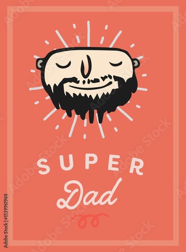 © vectorfusionart, Naklejka premium Flat design bearded head is radiating white lines on coral with rectangular border SUPER Dad text
