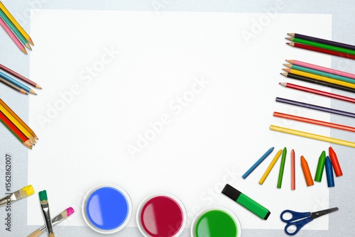 Obraz premium Flat design blank white sheet is lying on silver desk, framed by colored art supplies, scissors