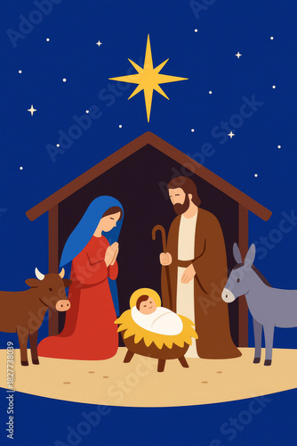 Obraz premium Flat design Christmas Nativity scene featuring Mary, Joseph, Baby Jesus Christ, under a star for use as a greeting card, religious religious biblical stock illustration image