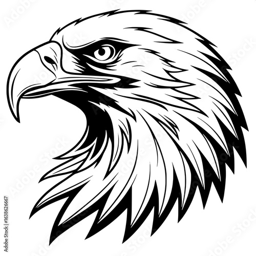 © Waqas, Obraz premium "Flat design eagle head silhouette, bold angular feather strokes, circular intense eye, sharp beak, pure white background, central profile composition, graphic logo style."