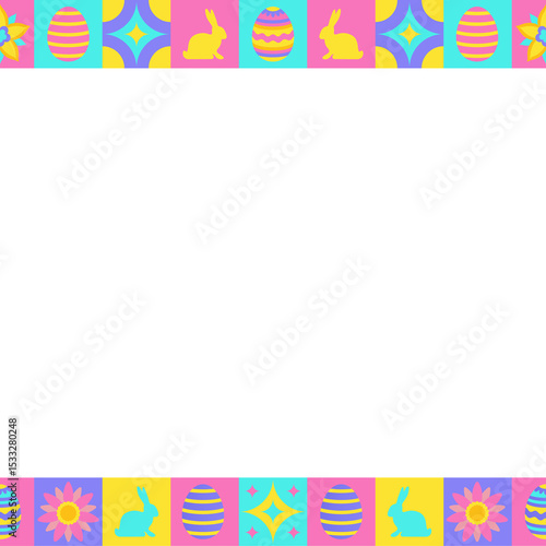 Fototapeta premium Flat design Easter frame is showing eggs, bunnies, flowers on transparent backdrop, copy space