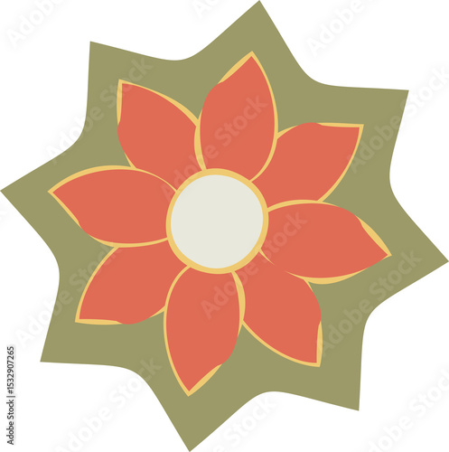 Obraz premium Flat-design floral graphic featuring central circle, coral petals on olive starburst, transparent