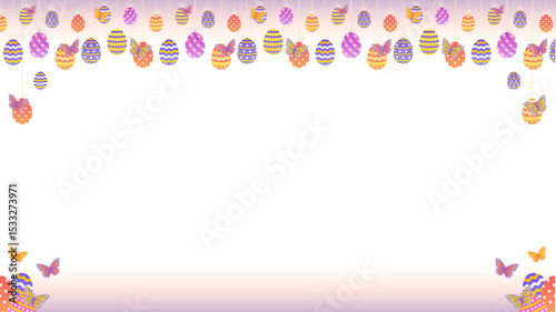 Fototapeta premium Flat design frame is showing Easter eggs and butterflies on transparent background, copy space