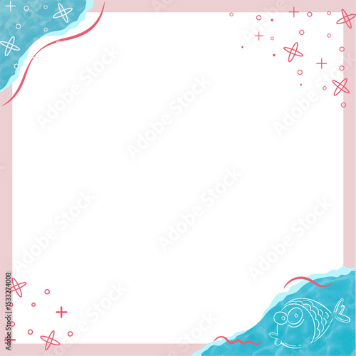 © vectorfusionart, Naklejka premium Flat design frame showing pink border, blue strokes, white doodles, fish on clear layer, copy space