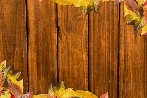 Obraz premium Flat design graphic is featuring vertical wooden planks with autumn leaves framing edges