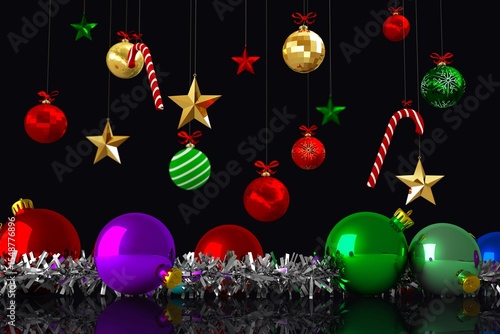 Fototapeta premium Flat design holiday baubles, candy canes and stars are hanging over tinsel against black backdrop