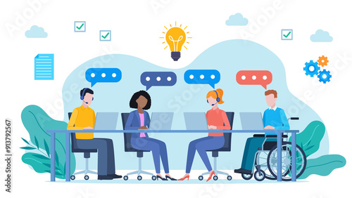 Obraz premium Flat design illustration. Employees at their desks brainstorm. There are speech bubbles next to their heads. There is a lit bulb above them. Next to them there are checker, document and gear icons.