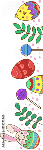 Fototapeta premium Flat design is featuring pastel Easter eggs, bunny shell, leaves, lollipops, transparent background