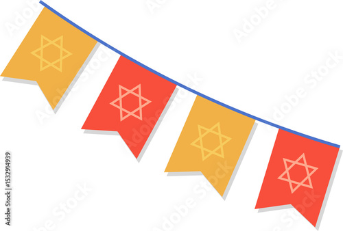 Fototapeta premium Flat design is showing blue cord hanging 4 red-yellow pennants with 6-point stars on clear backdrop