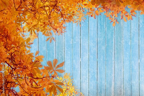 Fototapeta premium Flat design is showing golden autumn leaves and dark branches against weathered blue wooden planks