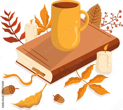 © vectorfusionart, Obraz premium Flat design is showing mug on book with melted candles and fall leaves on transparent background