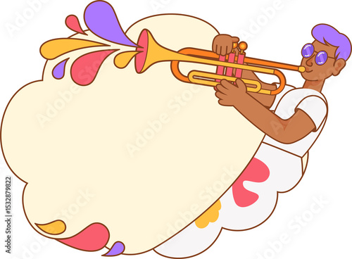 Fototapeta premium Flat design is showing musician playing brass trumpet emitting colorful splashes on transparent bg