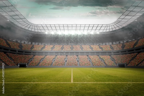 Obraz premium Flat design is showing pitch with white center line, stadium roof, floodlights, red-yellow seating