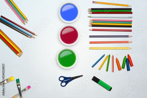 Naklejka premium Flat design is showing top-down art workspace with white paint bowls and craft tools