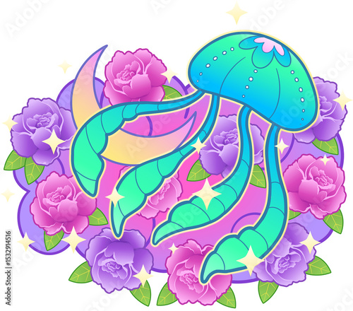 © vectorfusionart, Naklejka premium Flat design jellyfish is floating over camellia blooms with moon, stars, transparent background