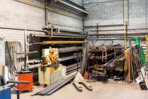 © vectorfusionart, Fototapeta premium Flat design metal shop is showing horizontal rack holding steel bars with cutting machine