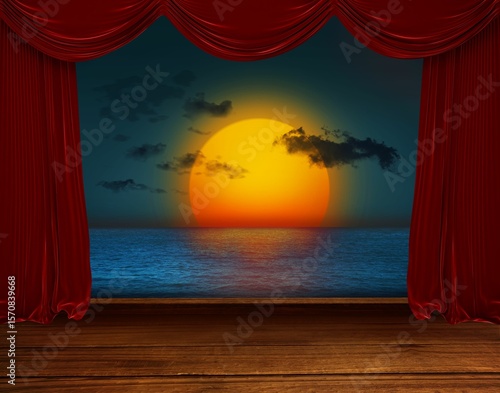 Obraz premium Flat design ocean sunset is unfolding on theater stage, with red velvet curtains and wooden floor