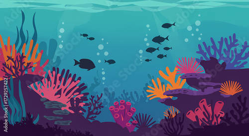 Fototapeta premium Flat Design of Deep Ocean Marine Life Background with Colorful Corals