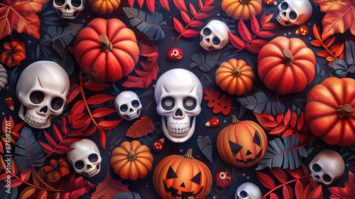© Mongkol, Obraz premium Flat design of Halloween night with skulls and pumpkins.