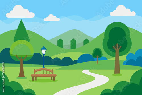 Obraz premium Flat design park scene with trees bench and path