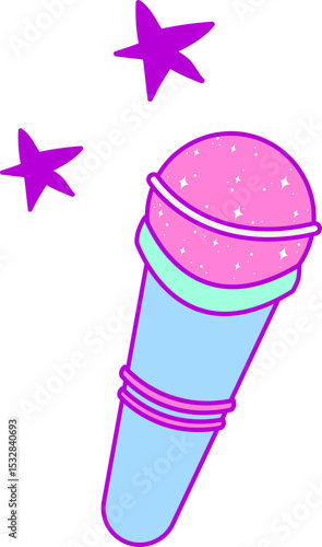 © vectorfusionart, Naklejka premium Flat design pastel microphone shining with glitter and floating stars on transparent background