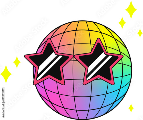 © vectorfusionart, Naklejka premium Flat design rainbow disco ball shining with striped stars and sparkles on transparent background