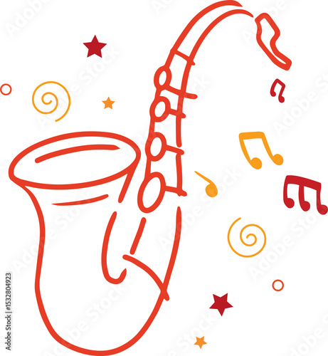 Naklejka premium Flat design saxophone is floating on transparent layer, swirling musical notes, stars and spirals