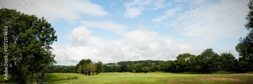 © vectorfusionart, Fototapeta premium Flat design showing panoramic grass field with pond beside deciduous trees under cloudy sky