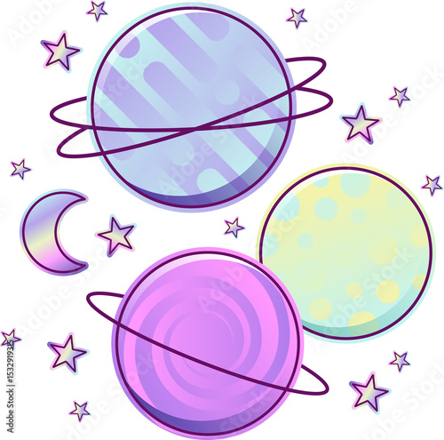 © vectorfusionart, Naklejka premium Flat design showing three floating pastel planets with rings, moon, stars on transparent background