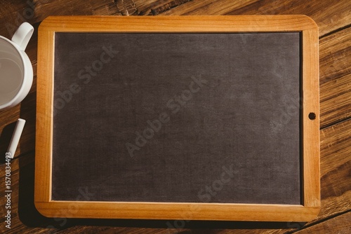 Obraz premium Flat design showing wood-framed chalkboard is lying on plank tabletop, with ceramic mug and chalk