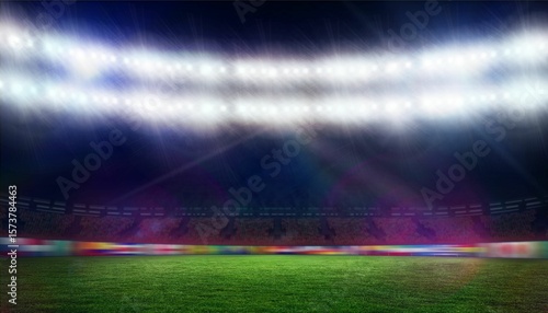 Fototapeta premium Flat design tiered seating and grass field are glowing under floodlights, showing digital boards