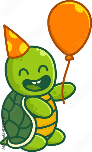 Fototapeta premium Flat design turtle is partying on transparent background with party hat and holding orange balloon