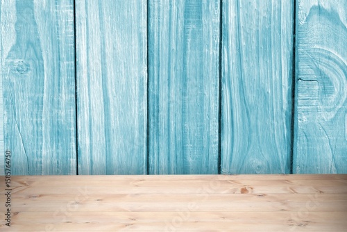 Fototapeta premium Flat design vector featuring light natural wood tabletop surface against turquoise plank wall