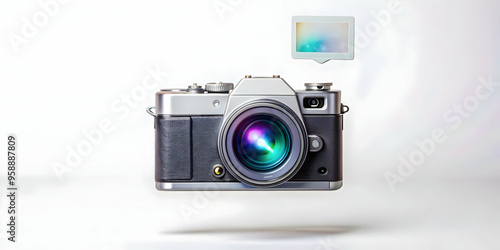 Fototapeta premium Flat Digital Camera with Holographic Memory Card Icon Floating Concept in...