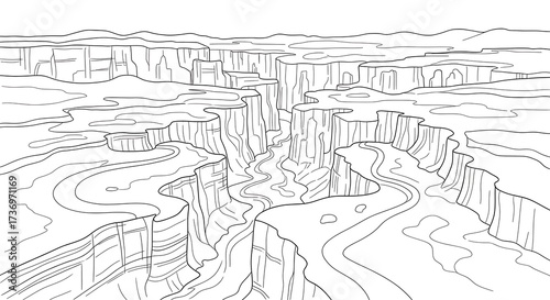 © naa, Obraz premium Flat doodle outline of a canyon with winding paths and rock formations