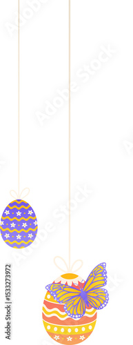 Fototapeta premium Flat Easter eggs hanging on ribbon bows showing butterfly pastel patterns on transparent background
