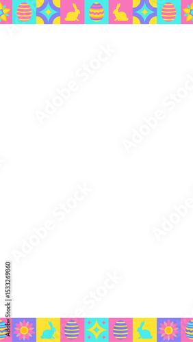 © vectorfusionart, Obraz premium Flat Easter frame is showing pastel bunny, striped eggs, stars, daisies, transparent bg, copy space