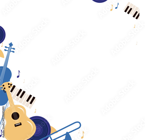 © vectorfusionart, Naklejka premium Flat frame is forming on clear background with guitar, cello, piano, trombone, notes, copy space