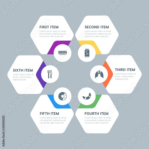 Fototapeta premium Flat geometric food, health, hotel, drinks infographic steps template with 6...