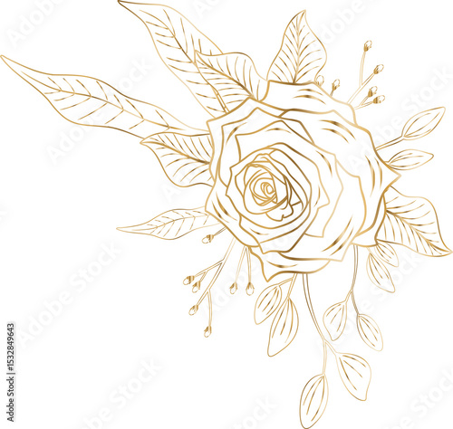 © vectorfusionart, Fototapeta premium Flat gold-lined rose is appearing as corner accent with leaves and buds transparent background