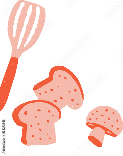 © vectorfusionart, Naklejka premium Flat graphic is showing coral slotted spatula with three pink mushrooms on transparent backdrop