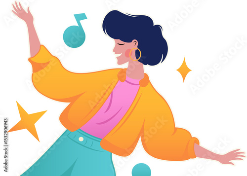 Fototapeta premium Flat illustration depicting dancing woman, floating music notes and stars on transparent background
