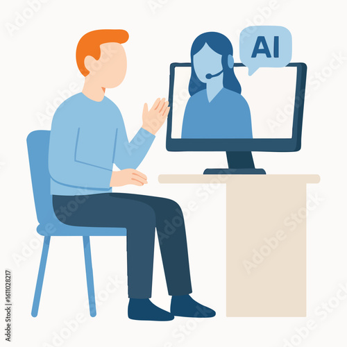© Mariposa1818, Obraz premium Flat Illustration Man Talking with AI Customer Service on Computer