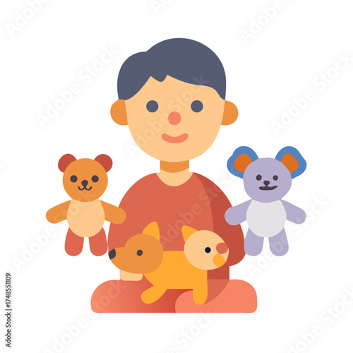 © Sharuzzaman, Naklejka premium Flat illustration of a boy with stuffed animals