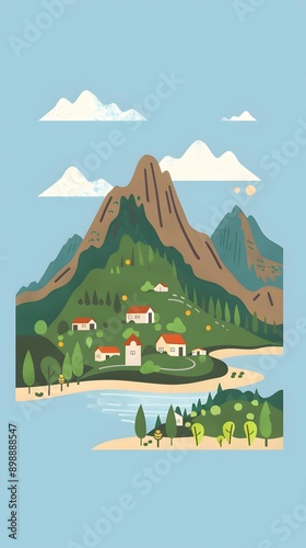 Naklejka premium Flat Illustration of a Mountain Landscape with Houses, Trees, and a River